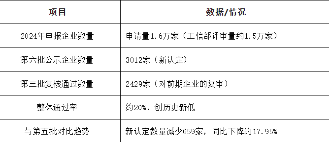 严格的审核机制:2025年的认定工作采用了更加科学、透明和高效的审核体系,信部将引入数据提取、人工智能、大数据等分析工具,加强申请数据的分析比对和逻辑判断。2025年的审核流程更强调省级初核推荐和部级审核认定的分段审核与多级把关机制,整体通过率控制在20%左右。